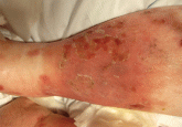 She has a painful, inflamed eroded plaque at the previous site of an intravenous catheter. She is afebrile, and blood cultures and tissue cultures...