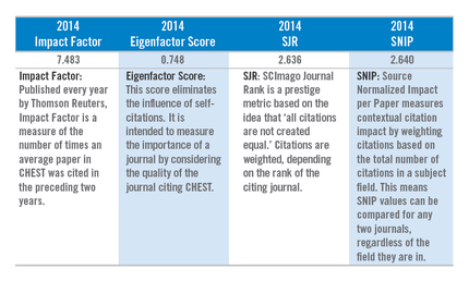 The new Thomson Reuters Journal Citation Report Impact Factor (IF) numbers for this past year were recently released, and we are pleased to announce that the CHEST IF for 2014 has increased from 7.132 to 7.483, once again setting a record for CHEST. In addition, CHEST’s Eigenfactor Score (a measure that eliminates the influence of self-citations) for 2014 is 0.748, which ranks CHEST as 2nd in both the Respiratory and Critical Care categories of the Journal Citation Reports.
