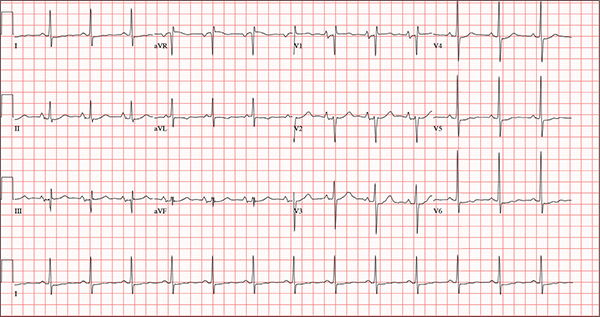 A 54-year-old man presents with a four-day history of productive cough, low-grade fever, and malaise. The patient, a long-haul trucker, has been on the road for the past 30 days, traveling from Florida to California, and then to New Jersey. He first noticed a change in his cough after leaving Chicago. He says he’s tried OTC cough syrups to no avail, and he wants you to prescribe antibiotics so he can get back to work. He denies blood in his sputum; the specimen he provides on request is yellow, mucoid, and malodorous. You know this patient well: He has been in your patient panel for the past five years. His active problem list includes chronic obstructive pulmonary disease, hypertension, type 2 diabetes, obesity, and heavy tobacco use. He is rarely compliant with any of the treatment regimens you prescribe, and he frequently misses scheduled appointments due to his job. The patient is divorced, with no children, and spends most of his time on the road. His family history is remarkable for diabetes and hypertension in both parents. He had a history of binge drinking in his early 20s but has never had a citation for driving under the influence. He denies current recreational drug use, but he admits to using amphetamines prior to his employer’s mandatory drug monitoring. He smokes 2 to 2.5 packs of cigarettes per day and always has one in his mouth. His surgical history includes appendectomy and cholecystectomy, as well as two laparoscopic procedures for abdominal adhesions. His current medication list includes an albuterol inhaler, hydrochlorothiazide, metoprolol, and metformin; however, he states he rarely takes any of them on a daily basis. He is allergic to tetracycline, which produces urticaria and a rash. Vital signs include a blood pressure of 168/114 mm Hg; pulse, 80 beats/min; respiratory rate, 14 breaths/min-1; O2 saturation, 92% on room air; and temperature, 101°F. The review of systems is positive for headaches, toothache in numbers 13 and 14, and bleeding hemorrhoids. The remainder of the review is noncontributory. The physical exam reveals a disheveled male who appears uncomfortable and diaphoretic. His weight is 314 lb and his height, 70 in. Pertinent physical findings include consolidation in the right lower chest that does not change with coughing. He has coarse respiratory sounds in all other lung fields. There are no murmurs or rubs; however, there is a fixed, split-second heart sound that you haven’t heard in previous exams. The patient’s abdomen is rotund and nontender, with wellhealed surgical scars. Two large, inflamed hemorrhoids are present, and a stool guaiac test is positive for blood. The peripheral exam reveals 2+ bilateral pitting edema. All pulses are full, and there are no focal neurologic abnormalities. Given your concern about the unfamiliar heart sound, you order an ECG in addition to laboratory bloodwork and chest x-ray. The white blood cell count measures 12.4 x 1,000 μL, and the chest xray is consistent with right lower lobe pneumonia. The ECG reveals a ventricular rate of 82 beats/min; PR interval, 148 ms; QRS duration, 82 ms; QT/QTc interval, 378/441 ms; P axis, 42°; R wave axis, 20°; and T axis, 96°. What is your interpretation of this ECG?