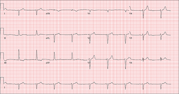 One week ago, a 67-year-old African-American woman with a history of diabetes, hypertension, and smoking developed a nonproductive cough and chest discomfort. Over the past 24 hours, her symptoms have progressed, with increasing fatigue. She has delayed seeking care to spend time with visiting family, but this morning she calls for an appointment. At presentation, she describes her chest discomfort as a “vague, dull ache.” She denies sharp chest pain, radiation, syncope, near-syncope, and palpitations. She says her cough has resolved, aside from her usual early-morning “smoker’s cough.” However, she still experiences fatigue with exertion and must stop to rest after walking up one flight of stairs or about half a block on level ground. When asked about gardening, her favorite hobby, she tells you she stopped last week because she “didn’t have the energy” for it. Her medical history is remarkable for type 2 diabetes (for the past 10 years) and hypertension, for which she has been treated her entire adult life. She also has osteoarthritis. In the 20 years she has been in your patient panel, she has closely monitored her health and been vigilant about taking her medications. Her surgical history is remarkable for hysterectomy, cholecystectomy, and bilateral bunion resections. The patient retired two years ago after a 20-year career as a tax attorney. Her husband died of a myocardial infarction at age 56. She has two adult children, who also have hypertension. She has a 50–pack-year history of tobacco use and smokes up to one full pack of cigarettes per day. She denies alcohol and illicit drug use, aside from the occasional “nip” of brandy and infrequent marijuana use. Her medication list includes metformin, glyburide, hydrochlorothiazide, and lisinopril. She is allergic to sulfa. The review of systems is remarkable for hearing loss, diabetic neuropathy in both feet, and chronic loose stools. Vital signs include a blood pressure of 148/88 mm Hg—higher than measurements from her past three visits. Her pulse is 60 beats/min; respiratory rate, 14 breaths/min-1; and temperature, 98.8°F. On physical exam, her weight is 201 lb and her height is 68 in; her weight has remained stable over the past two years. The HEENT exam findings include corrective lenses, bilateral hearing aids, and extensive dental work (including veneers). The neck is supple, without thyromegaly or jugular venous distention. The lungs are clear in all fields, apart from occasional crackles in both bases that clear with coughing. Her cardiac exam reveals a regular rate with no extra heart sounds or rubs, but a soft, early diastolic murmur at the left lower sternal border. The abdomen is soft and nontender with well-healed surgical scars and no palpable masses. Osteoarthritis is present in both hands, and her left hip has decreased range of motion, compared to her right. Peripheral pulses are strong bilaterally, and her neurologic exam is intact. You draw laboratory specimens and order a chest x-ray and ECG, which reveals a ventricular rate of 56 beats/min; PR interval, unmeasurable; QRS duration, 106 ms; QT/QTc interval, 400/386 ms; P axis, 36°; R axis, 120°; and T axis, 7°. What is your interpretation of this ECG?