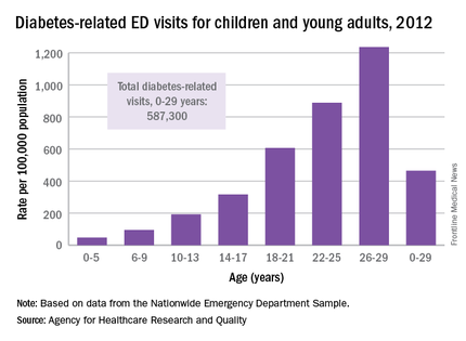 Young adults aged 18-29 years made diabetes-related ED visits at a rate of 905 per 100,000 in 2012, compared with 149 per 100,000 for children 17 and under. Narrowing down the age groups shows even greater differences: The rate was 47 per 100,000 for children aged 5 years and under, 95 for children aged 6-9, 193 for 10- to 13-year-olds, 316.5 for those aged 14-17, 607 for 18- to 21-year-olds, 889 for 22- to 25-year-olds, and 1,236 for those aged 26-29 years, the AHRQ reported.
