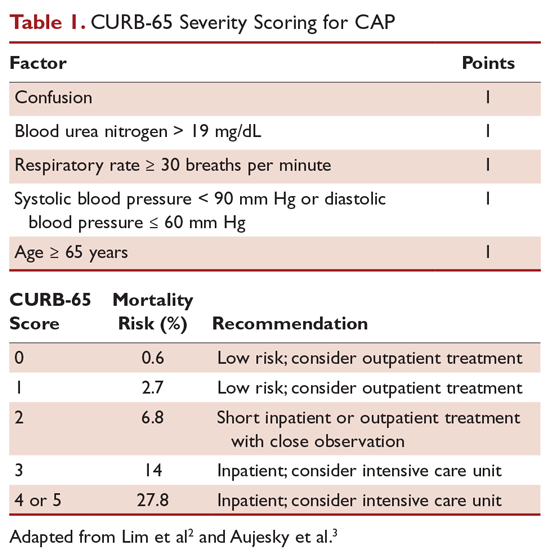 The CURB-65 method of risk stratification is based on 5 clinical parameters: confusion, urea level, respiratory rate, systolic blood pressure, and age ≥ 65 years (Table 1).2,3 A modification to the CURB-65 algorithm tool was CRB-65, which excludes urea nitrogen, making it optimal for making determinations in a clinic-based setting. It should be emphasized that these tools do not take into account other factors that should be used in determining location of treatment, such as stable home, mental illness, or concerns about compliance with medications. In many instances, it is these factors that preclude low-risk patients from being treated as outpatients.4,5 Similarly, these scoring systems have not been validated for immunocompromised patients or those who would qualify as having health care–associated pneumonia.