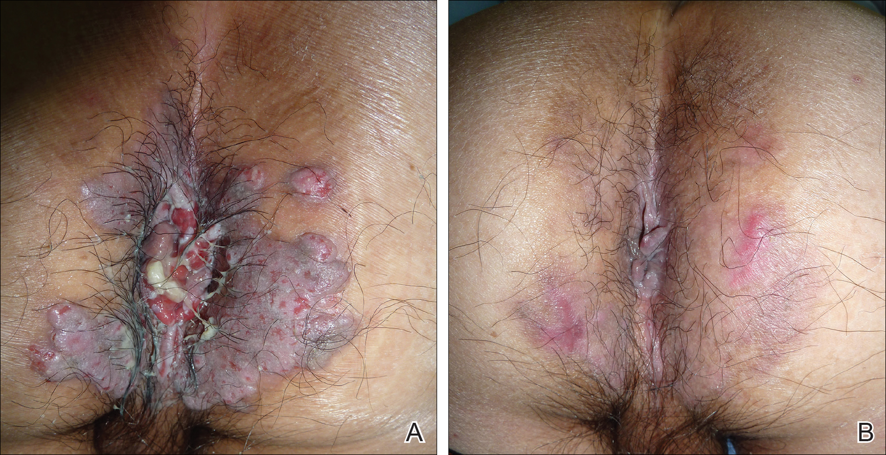 The patient was started on oral prednisolone at 1 mg/kg daily and oral azathioprine 50 mg daily with resolution of the perianal, penile, and oral ulcers (Figures 1 and 2). He achieved good suppression of further eruption. At the patient's most recent follow-up (2.5 years after the initial presentation), he was in remission and was currently taking oral azathioprine 100 mg once daily and no oral corticosteroids.