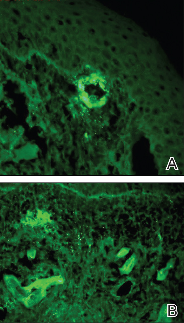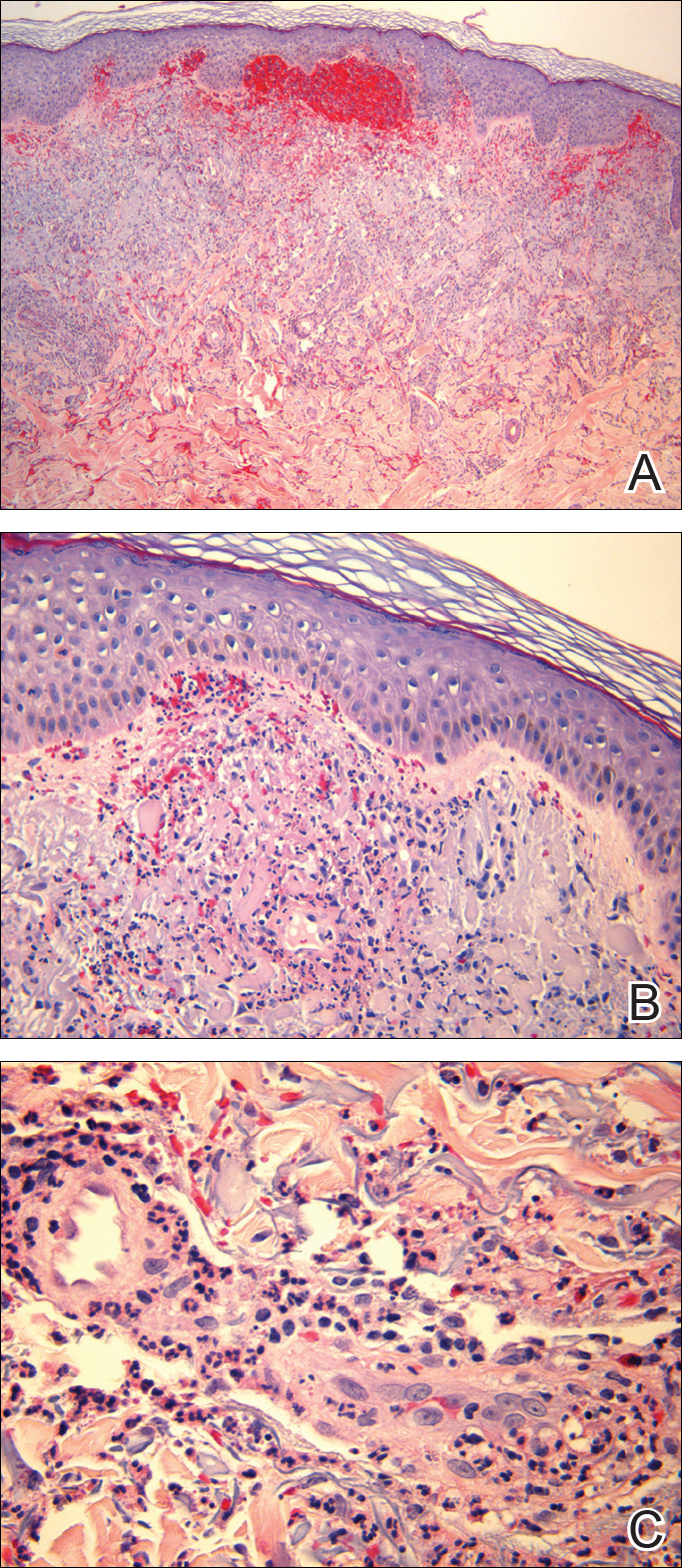 Punch biopsies of lesions from the right upper arm were obtained. Hematoxylin and eosin staining revealed neutrophilic-predominant small vessel vasculitis (Figure 2A) with the upper dermal location more heavily involved, as demonstrated by involvement of a superficial vascular plexus (Figures 2B and 2C) that was consistent with Henoch-Schönlein purpura (HSP). The diagnosis later was confirmed with immunofluorescence. Direct immunofluorescence revealed granular IgA deposition around the superficial vascular plexus (Figure 3). No IgG, IgM, C3, C5b-9 complement complex, or fibrinogen deposition was seen. Additionally, periodic acid-Schiff staining failed to show microorganisms, thrombi, or intravascular hyaline material.