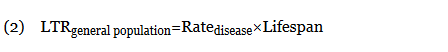 When not available, the LTRgeneral population was calculated from the rate of disease (cases per 100,000 individuals per year) multiplied by the average lifespan of an American (78.8 years)10:
