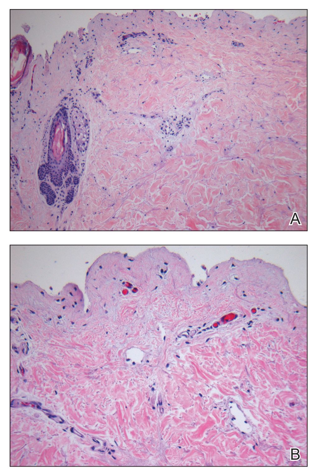 The clinical picture of SDRIFE has remained obscure over the last 30 years, likely owing to its rarity and unclear pathogenesis. Diagnostic criteria for SDRIFE were first proposed by Häusermann et al2 in 2004 and contained 5 elements: (1) occurrence after (re)exposure to systemic drugs, (2) sharply demarcated erythema of the gluteal region or V-shaped erythema of the inguinal area, (3) involvement of at least 1 other intertriginous location, (4) symmetry of affected areas, and (5) absence of systemic symptoms and signs. Based on these clinical criteria, our patients fulfilled 3 of 5 elements, with deductions for symmetry of affected areas and involvement of other intertriginous locations. Histopathologic findings in SDRIFE predominantly are nonspecific with superficial perivascular mononuclear infiltrates; however, prior reports have confirmed the potential for vacuolar changes and hydropic degeneration in the basal cell layer with subepidermal bullae formation.5,6 Similarly, although the presence of bullae are somewhat atypical in SDRIFE, it has been described.3 Taken together, we speculate that these findings may support a diagnosis of SDRIFE with atypical presentation, though an alternative diagnosis of bullous fixed drug eruption (FDE) cannot be ruled out.
