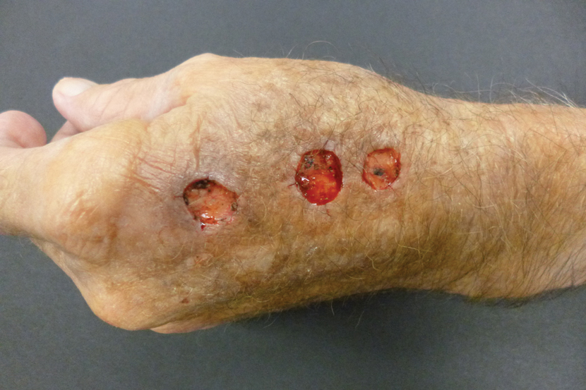 An elderly man had 3 nonmelanoma skin cancers—all on the dorsal aspect of the left hand—that were treated on the same day, leaving 3 similar wound defects after Mohs micrographic surgery. The wound defects (distal to proximal) measured 12 mm, 12 mm, and 10 mm in diameter (Figure 1) and were repaired by primary closure, secondary intention, and purse-string circumferential closure, respectively. Purse-string closure1 was performed with a 4-0 polyglactin 901 suture and left to heal without external sutures (Figure 2). Figure 3 shows the 3 types of repairs immediately following closure. All wounds healed with excellent and essentially equivalent cosmetic results, with excellent patient satisfaction at 6-month follow-up (Figure 4).