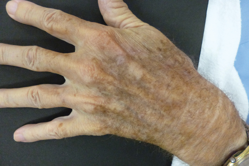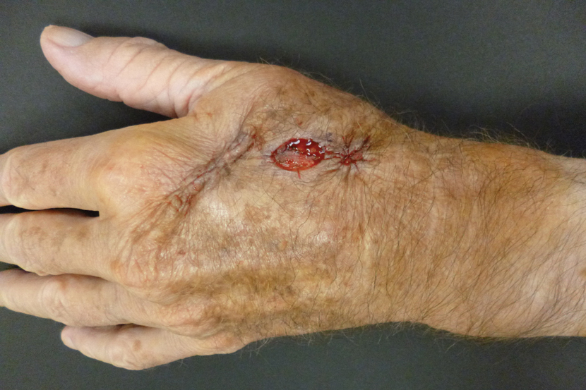 Our case illustrates different modalities of wound repair during precisely the same time frame and essentially on the same location. Skin of the dorsal hand often is tight; depending on the size of the defect, large primary closure can be tedious to perform, can lead to increased wound tension and risk of dehiscence, and can be uncomfortable for the patient during healing. However, primary closure typically will lead to faster healing.