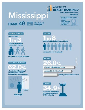 Next door, Mississippi is plagued with a high prevalence of sedentary lifestyle, obesity, diabetes, infant mortality, smoking, and cardiovascular death, according the foundation report. The state is ranked 48th in terms of the number of primary care physicians. Gov. Phil Bryant (R) has said his state will create its own health exchange, but will not opt for the Medicaid expansion.