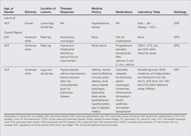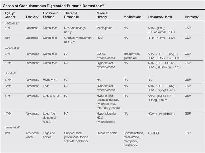 Pigmented purpuric dermatoses comprise a spectrum of clinical and pathologic conditions.1,2 Granulomatous PPD is a much less common variant, characterized by a granulomatous infiltrate admixed with PPD. We report 3 additional cases and review the literature on this rare and interesting variant of PPD.