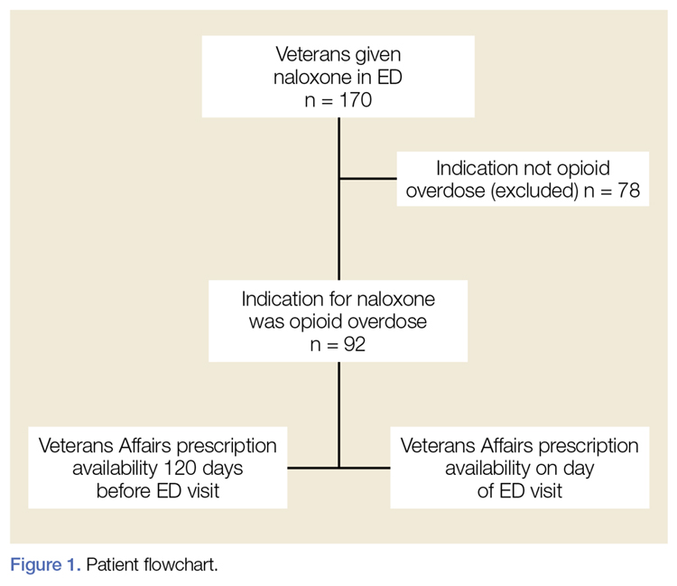 This retrospective review identified 92 veterans who were treated with naloxone in the ED for opioid overdose during a 4-year period at the George E. Wahlen VAMC. Seventy-eight cases were excluded because the reason entered in charts for naloxone administration was itching, constipation, altered mental status, or unclear documentation.