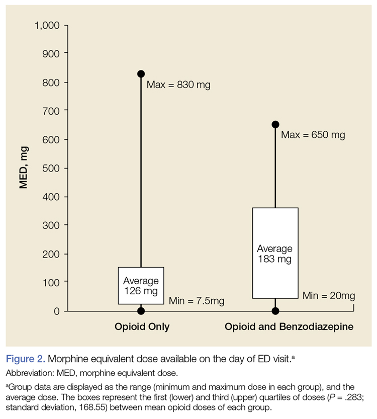 The dosage of opioids and BZDs available to a veteran was determined by using methods similar to those described by Gomes et al18: the dose of opioids and BZDs available based on prescriptions dispensed during the 120 days prior to the ED visit date and the dose available on the day of the ED visit date if prescription instructions were being followed. Prescription opioids and BZDs were converted to daily morphineequivalent dose (MED) and daily lorazepam equivalent dose (LED), using established methods.19,20