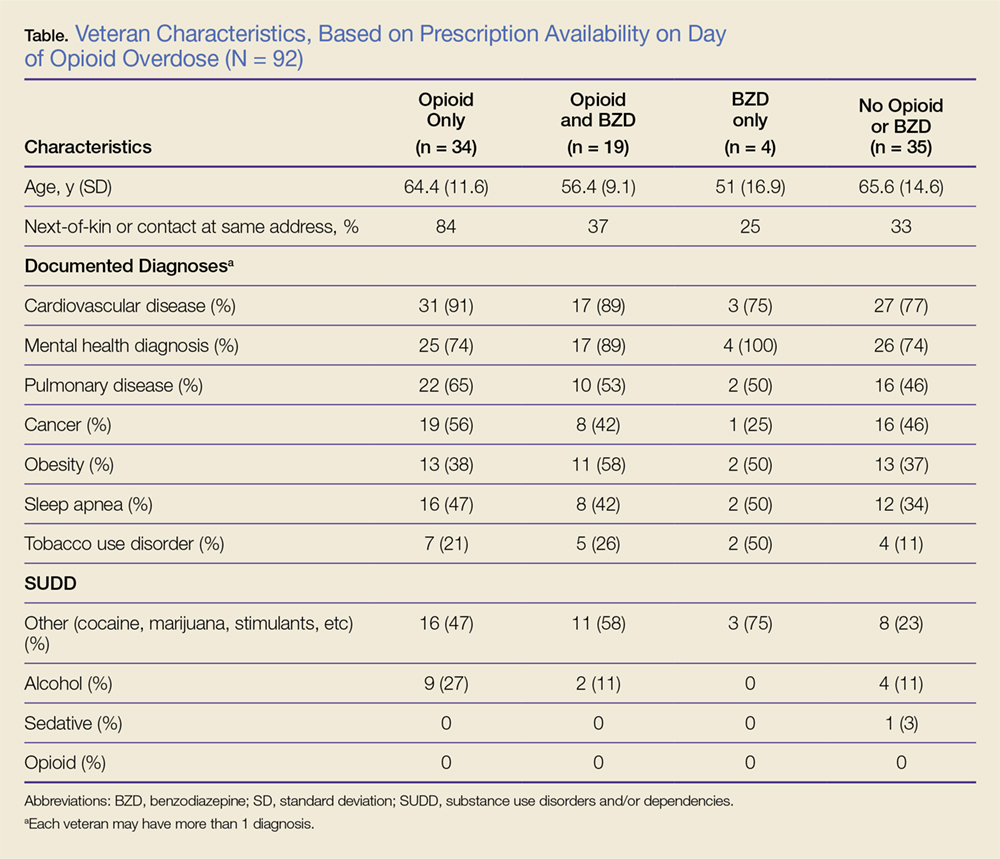 All veterans had at least one diagnosis that in previous studies was associated with increased risk of overdose.9,15 The most common diagnoses included CVD, mental health disorders, pulmonary diseases, and cancer. Other SUDDs not including tobacco use were documented in at least half the veterans with prescribed opioids and/or BZDs. No veteran in the sample had a documented history of opioid SUDD.