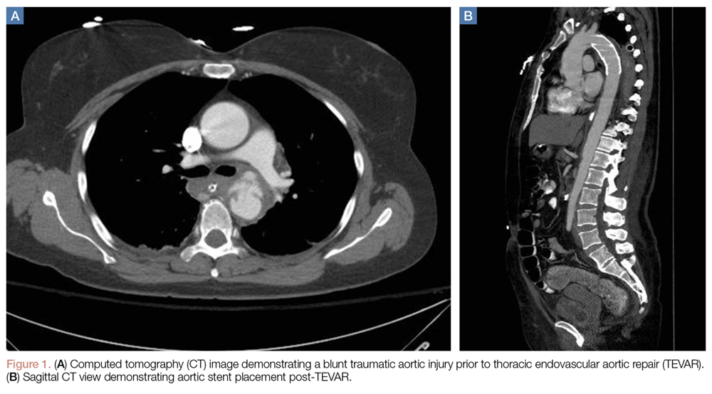 Thoracic endovascular aortic repair (TEVAR) for blunt thoracic aortic injury has essentially replaced open surgical repair. (See Figures 1a and 1b for an example of a blunt traumatic aortic injury prior to and post-TEVAR placement.)