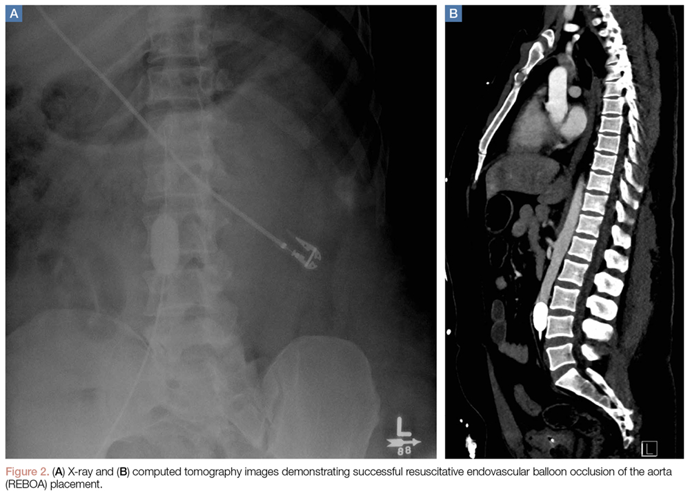 Depending on suspected or known location of the source of hemorrhage, this is either just proximal to the diaphragm (zone 1), or just proximal to the aortic bifurcation (zone 3). (See Figures 2a and 2b for an example of successful REBOA placement.)Once inflated, the balloon obstructs arterial inflow to the area of hemorrhage, curtailing blood loss, and increases proximal BP, improving coronary and cerebral perfusion. Multiple case reports and case series have described successful use of REBOA for hemorrhage control, including prehospital use by physicians in the United Kingdom. The largest series to date looked at 114 patients, of whom 46 had REBOA placement and 68 had open aortic occlusion through resuscitative thoracotomy.45 Those treated with REBOA were significantly more likely to achieve hemodynamic stability (defined as SBP >90 mm Hg for >5 minutes). Furthermore, the authors noted minimal complications from REBOA and no difference in time to successful aortic occlusion, regardless of technique. There was also no difference in mortality between the two groups. Despite the small number of studies in trauma patients, REBOA has been established as a viable alternative to open aortic occlusion. The prospective Aortic Occlusion for Resuscitation in Trauma and Acute Care Surgery registry established by the American Association for the Surgery of Trauma is continuing to enroll patients and will hopefully answer many of the current uncertainties regarding the use of REBOA.