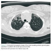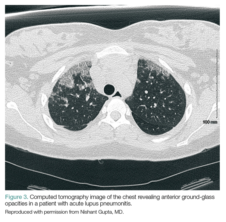 Acute Lupus Pneumonitis. This serious condition may present with severe pneumonia-like signs and symptoms, including fever, cough, dyspnea, hypoxia, and infiltrates on chest radiograph (Figure 3).