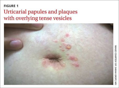 On exam, we noted light pink papules and plaques—some with overlying tense bullae—in and around her umbilicus (FIGURE 1), as well as on her abdomen, lower extremities, and within the left third and fourth web space of her toes. There were no lesions in the oral mucosa or near the groin or genitalia.