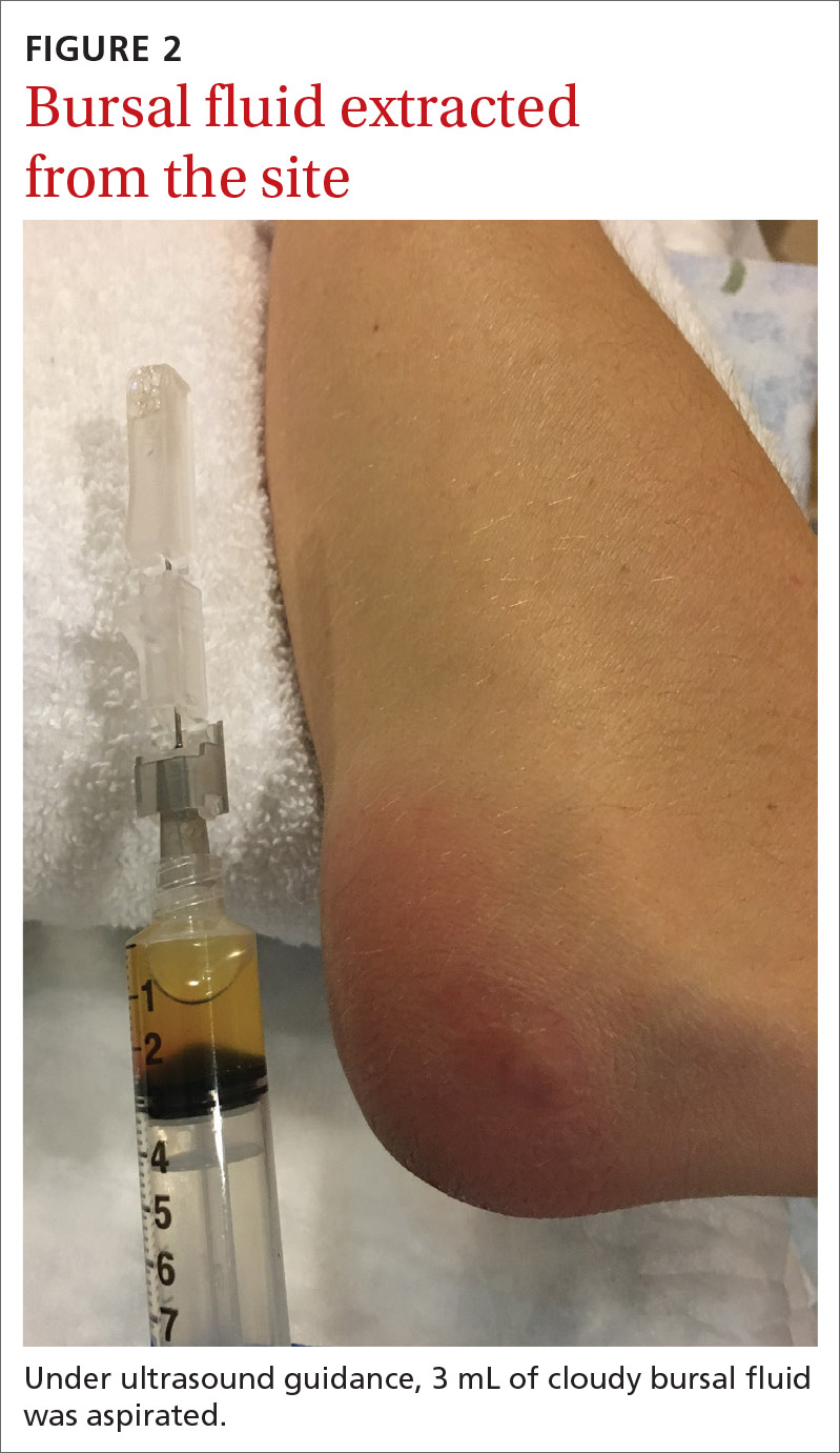 Aspiration of the patient’s olecranon bursa produced 3 mL of cloudy fluid (FIGURE 2). The patient’s painful, swollen, erythematous, warm elbow, cloudy aspirate, and history of preceding PIN hydrodissection were consistent with a diagnosis of septic olecranon bursitis.