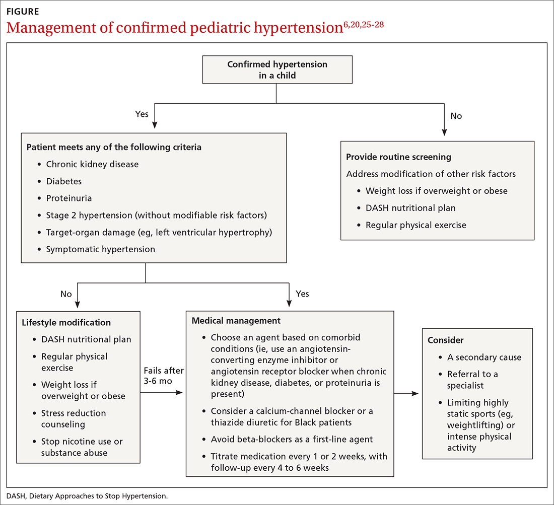 Pediatric hypertension should be treated in patients with stage 1 or higher hypertension.6 This threshold for therapy is based on evidence that reducing BP below a goal of (1) the 90th percentile (calculated based on age, sex, and height) in children up to 12 years of age or (2) of < 130/80 mm Hg for children ≥ 13 years reduces short- and long-term morbidity and mortality.5,6,25