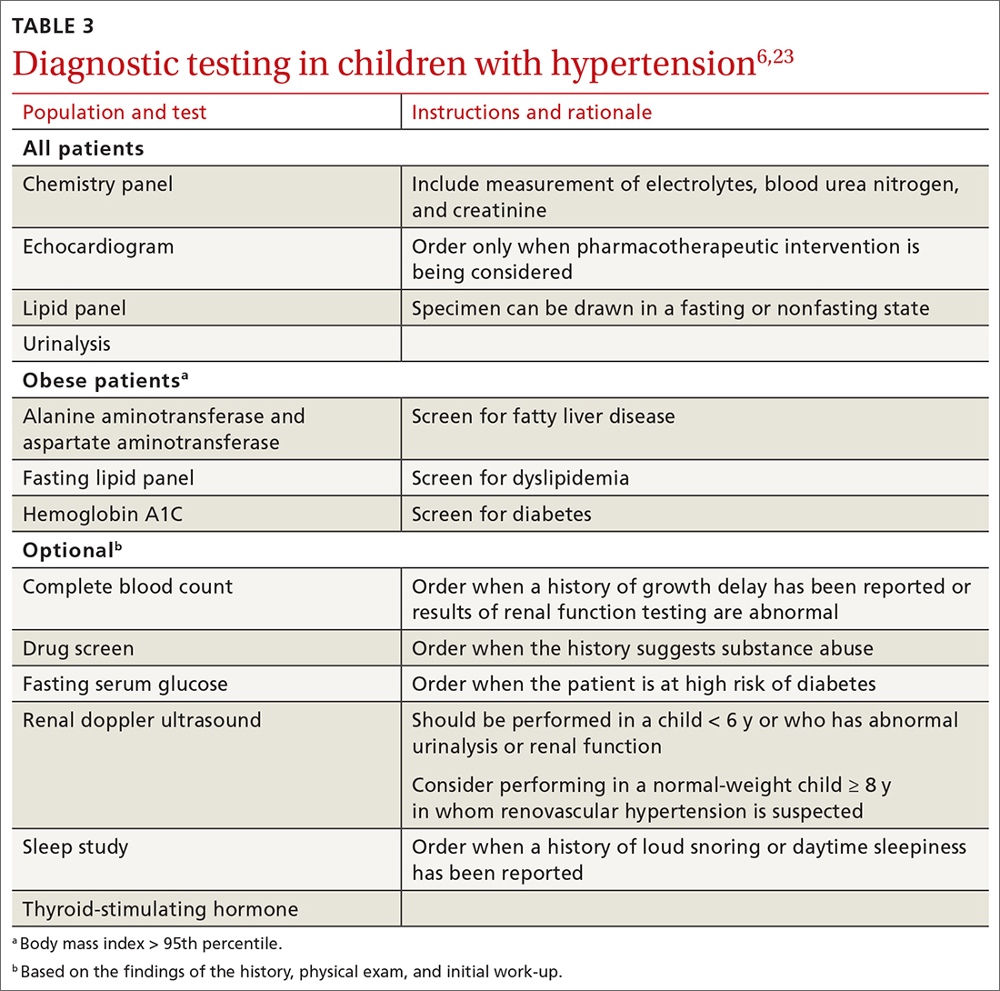 Testing.TABLE 36,23 summarizes the diagnostic testing recommended for all children and for specific populations; TABLE 26 indicates when to obtain diagnostic testing. Patients 6 years and older who are overweight or obese and have a family history of hypertension likely have primary hypertension; they do not require an extensive work-up for secondary hypertension unless findings of the comprehensive history and physical examination lead in that direction.6,23
