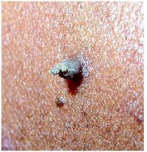 The lesion was asymptomatic except for its prominence and aesthetics. The patient had tried cutting the lesion off several times, but it regrew each time. She was married, mono-gamous by history, not pregnant, had no major underlying medical conditions, and had no personal or family history of skin malignancy. The remainder of the skin examination was normal.