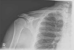 An AP view of the patient’s right shoulder shows acromioclavicular joint narrowing and degeneration and subtle narrowing of the acromiohumeral interval.