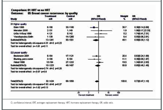 Graphic summary of studies on recurrence of breast cancer in ERT users vs nonusers