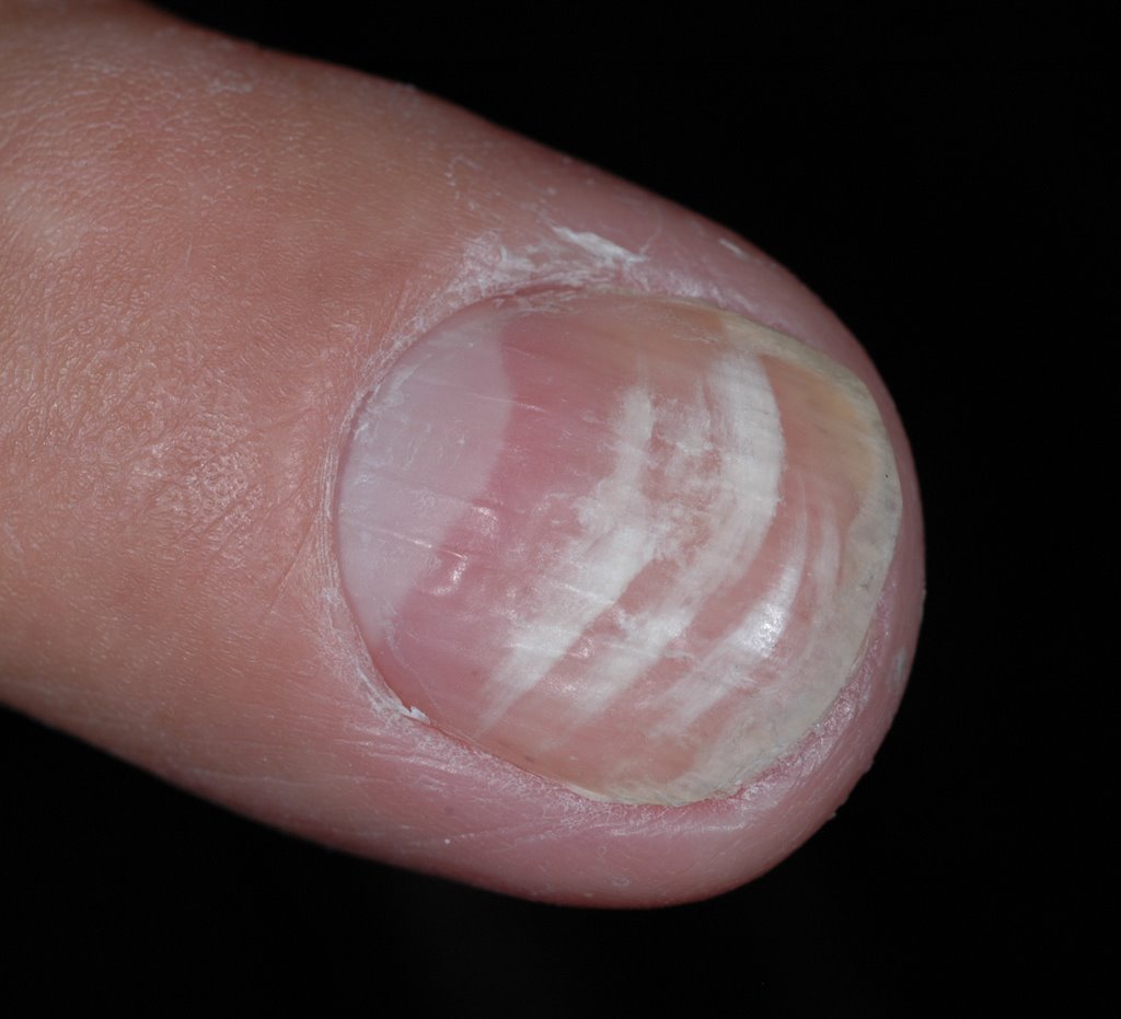 The patient was given a diagnosis of leukonychia, a benign condition involving white spots or lines in the nails. This young man had transverse striate leukonychia, but if the marks had been white spots, the diagnosis would have been leukonychia punctata.
