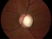 An eye exam will reveal conjunctival erythema, corneal edema and cloudiness, iris irregularity, a shallow anterior chamber (visible with a slit lamp), a dilated pupil (4-6 mm) that reacts sluggishly to light, and increased ocular pressure. The cupping of the optic disc seen in this patient’s retinal exam ( FIGURE 6 ) is more commonly associated with chronic open-angle glaucoma.