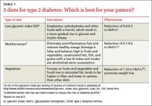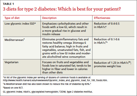 American Diabetes Association (ADA) guidelines do not endorse a specific diet. But patients often ask for dietary advice and want to know how specific diet plans and food choices will affect glycemic control and comorbid conditions. You can present the evidence (TABLE 1)4-6 of the effectiveness of a low glycemic index (GI) diet, a Mediterranean diet, and a vegetarian diet and point out that the best diet for a particular patient is the one best suited to his or her lifestyle and dietary goals.