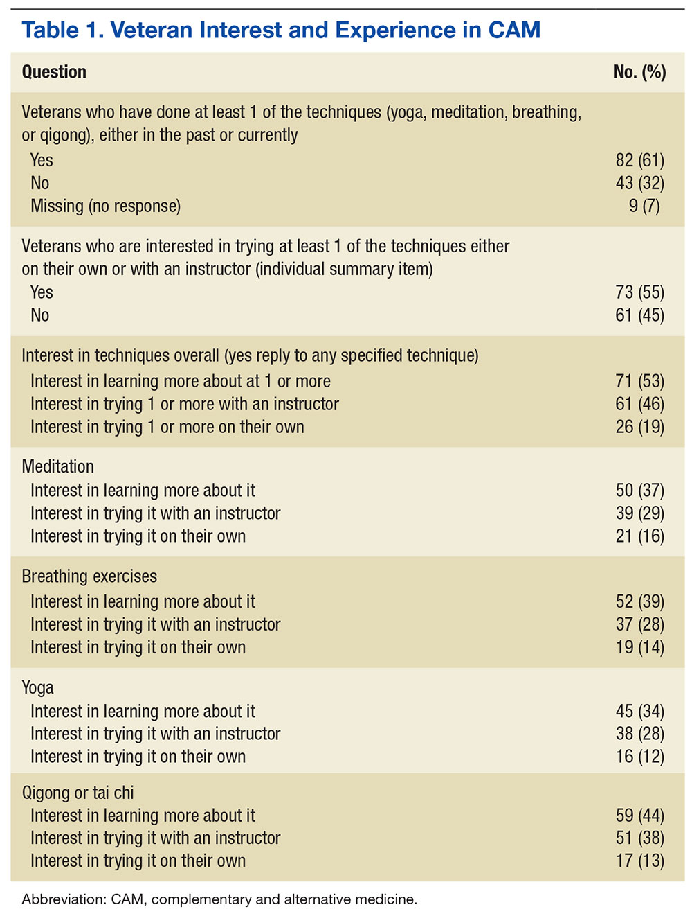 Table 1 shows veteran experience and interest in CAM practices. More than half of veterans who returned the survey reported doing either a CAM practice or having done 1 (n = 82; 61%). Many also reported interest in trying at least 1 practice (n = 73; 55%) or learning more about at least 1 practice (n = 71; 53%) either on their own or with an instructor. More veterans indicated they would prefer to try the techniques with an instructor (n = 61; 46%) rather than on their own (n = 26; 19%). Chi-square testing showed that interest and experience with CAM were not significantly associated with specific demographic characteristics.