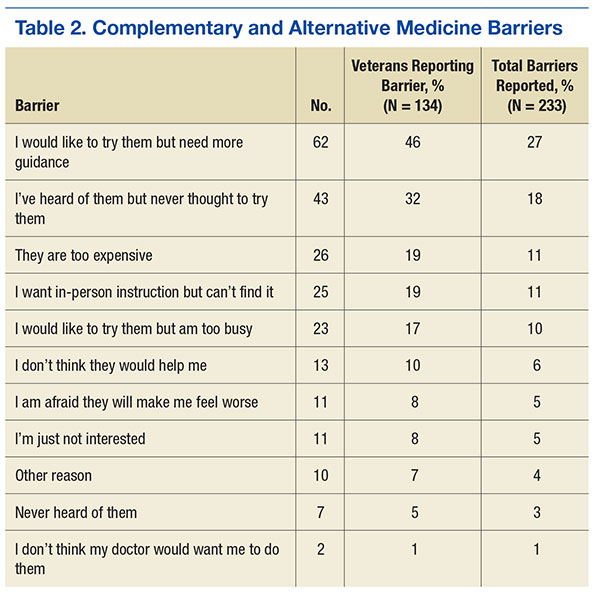 Several barriers to CAM practice were frequently cited (Table 2). The 2 most commonly endorsed barriers were veterans who wanted to try the techniques but needed more guidance (n = 62; 46%) and heard of CAM but never thought to try them (n = 43; 32%). Only a small percentage of veterans indicated that they did not think the practice would help (n = 13; 10%) or were concerned that it might hurt them (n = 11; 8%).