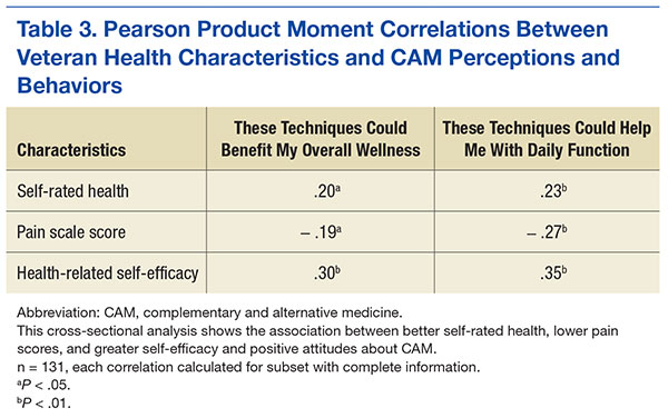 The authors report 3 main findings from this study: Personal characteristics are not associated with experience, interest in, or belief in the efficacy of CAM; despite a large proportion reporting experience with CAM, veterans reported several barriers to using CAM; and the level of pain reported moderated the relationship between health-related self-efficacy and the belief that CAM will help with daily function.