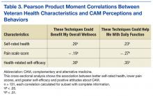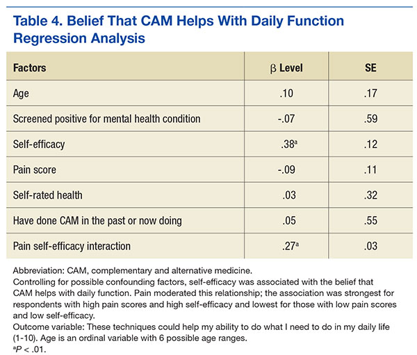Chronic pain can be a challenge for patients and clinicians to manage, so the role of CAM in pain management is growing.2,27 The study’s findings suggest that motivating veterans with chronic pain to try CAM may take extra effort by the clinician. Multivariate linear regression modeling showed that respondents with higher pain levels believed CAM could help with their function only if they also had high health-related self-efficacy, whereas those with low pain scores reported this belief even with low self-efficacy. Thus, strong self-efficacy may overpower doubts about CAM that accompany having pain. Conversely, high reported pain levels may reduce self-efficacy and lead to doubts about the benefit of CAM.