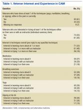 Determining which personal characteristics are associated with CAM perceptions may indicate who is willing to try CAM techniques and who may require additional education or support. Although the authors hypothesized a difference in experience, interest, and belief of efficacy according to patient characteristics, these differences were not demonstrated. Some published research supports an association between white race, female sex, and middle or younger age and use of CAM, but this sample of veterans did not confirm these associations.1,3,6-8