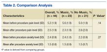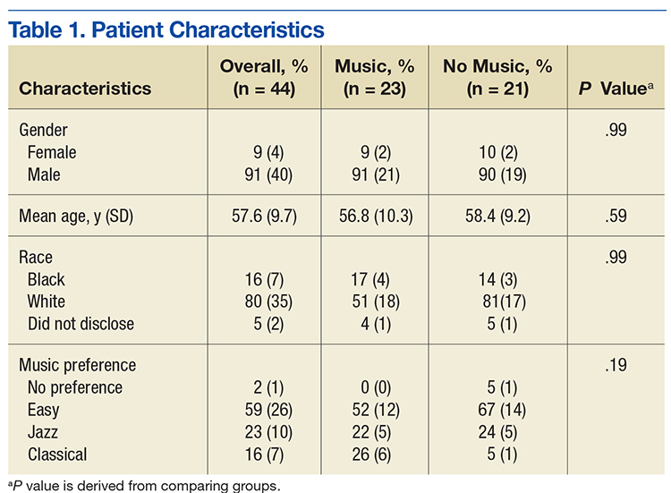As part of a quality improvement (QI) project, the authors conducted a literature search to find scientific evidence for the use of music therapy. Multiple medical databases were analyzed to find studies that included total time, dose of sedative medications, pain scores, patient experience, and willingness to repeat the same procedure in the future with use of music vs no music.1 The literature review revealed that music therapy demonstrated effectiveness in decreasing anxiety and pain, supporting relaxation, reducing sedation medication during procedures, and improving patient satisfaction.