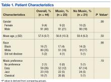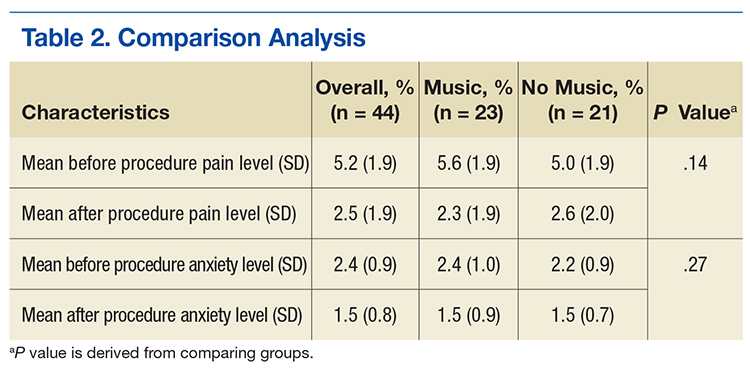 Veterans aged between 21 and 88 years who were scheduled to return for lumbar RFL and who did not require sedation were invited to participate. Sixty participants consented. The music group had 21 men and 2 women. The no-music group had 19 men and 2 women. Table 1 summarizes descriptive data. Table 2 describes the results of the comparison analysis. Patients were randomly assigned to either the music intervention group or no-music g