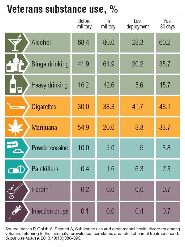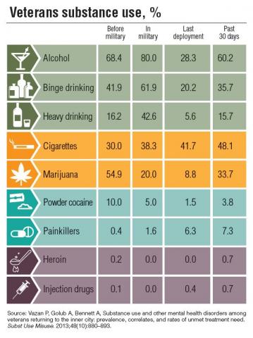 The dangers of substance abuse have been well known for many years. Despite these known risks, rates of alcohol and drug abuse remain high especially among active-duty and veteran populations. A 2008 DoD survey and a 2012 Institute of Medicine report suggest that substance abuse continues to grow in the military, showing a rising level of prescription drug abuse and binge drinking.