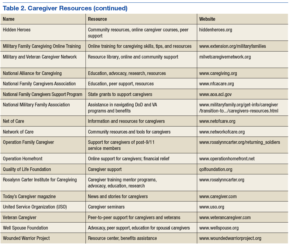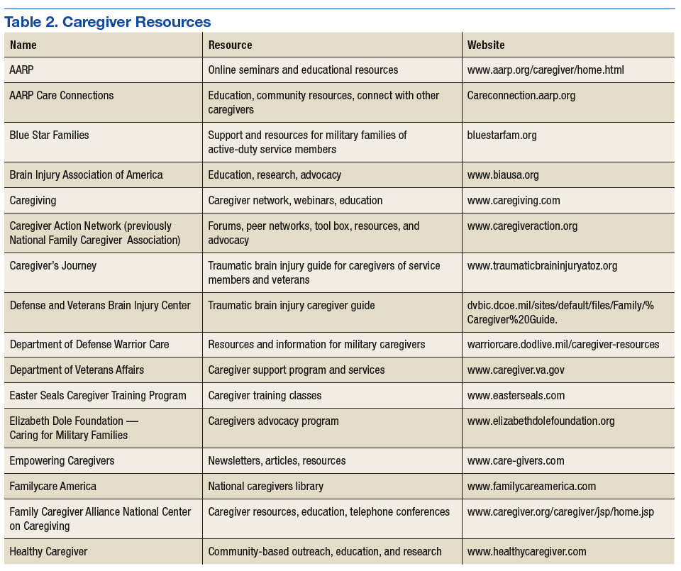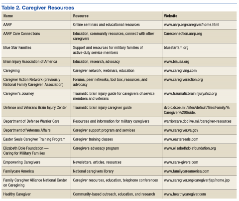 Many national, state, local, and grassroots organizations provide information and support for persons with illness and/or disabilities. Most clinicians of neurologic, mental health, and cancer have developed various forms of support interventions for those with the disease and their caregivers (Table 2). Highlighted in this section are a few organizations that specifically provide resources for caregivers caring for active-duty service members or veterans with a TBI.