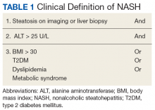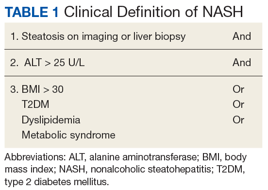 A first key step by the PCP is to identify whether a patient is at risk, especially patients with NASH. The majority of patients at risk are already seen by PCPs. While there is no consensus on ideal screening for NAFLD by PCPs, the use of ultrasound in the at-risk population is recommended in Europe.42 Although NASH remains a histopathologic diagnosis, a reasonable approach is to define NASH based on clinical criteria as done similarly in a real-world observational NAFLD cohort study.54 In the absence of chronic alcohol consumption and viral hepatitis and in a real-world scenario, NASH can be defined as steatosis shown on liver imaging or biopsy and alanine aminotransferase (ALT) levels of > 25 U/L. In addition, ≥ 1 of the following criteria must be met: BMI > 30, T2DM, dyslipidemia, or metabolic syndrome (Table 1).