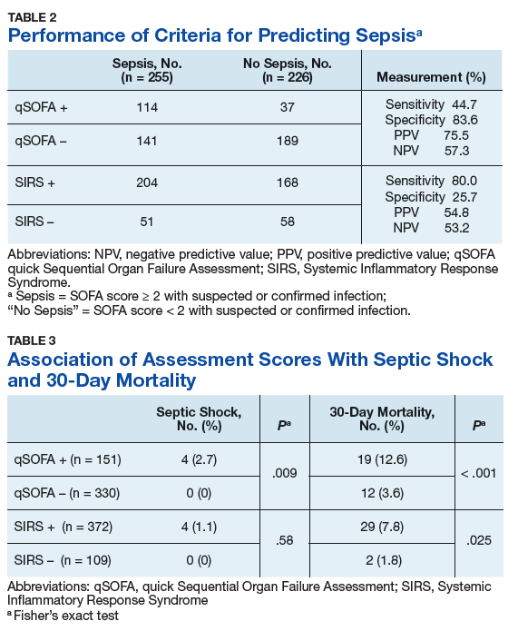Performance between the SIRS and qSOFA assessments was contrasted using sensitivity, specificity, and positive and negative predictive value measurements. Associations of qSOFA and SIRS with septic shock and 30-day mortality were evaluated using a 2-tailed Fisher’s exact test with a threshold of α = 0.05 to determine statistical significance.
