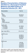 When predicting risk for sepsis, the qSOFA demonstrated lower sensitivity than SIRS (44.7% vs 80.0%) but higher specificity (83.6% vs 25.7%) and higher positive predictive value (75.5% vs 54.8%) than did SIRS (Table 2). Specificity and positive predictive value results indicated a good probability that veterans with positive qSOFA assessments actually had sepsis.Scores for qSOFA, but not SIRS, were significantly associated with septic shock (Fisher’s exact test; qSOFA: P = .009; SIRS: P = .58) (Table 3).