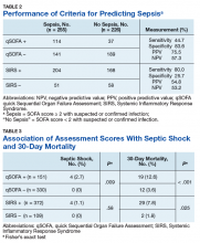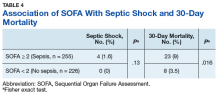 Both assessments were significantly associated with increased risk for 30-day mortality (Fisher’s exact test; qSOFA: P < .001; SIRS: P = .025). In an additional analysis, scores for SOFA were not significantly associated with septic shock (Fisher’s exact test, P = .13) but were significantly associated with an increased risk for 30-day mortality (Fisher’s exact test, P = .016) (Table 4).High sensitivity is critical for a sepsis screening tool. To be clinically useful, it has been suggested that biomarkers predicting poor outcomes for sepsis should have a sensitivity of > 80%.4 Although qSOFA demonstrated greater specificity than SIRS in our study (83.6% vs 25.7%), qSOFA showed lower sensitivity (44.7% vs 80.0%), which resulted in a greater potential for false negatives; 55.3% of those with sepsis would go undetected. Therefore, our study does not support qSOFA as a better screening assessment than SIRS for sepsis in the veteran population.