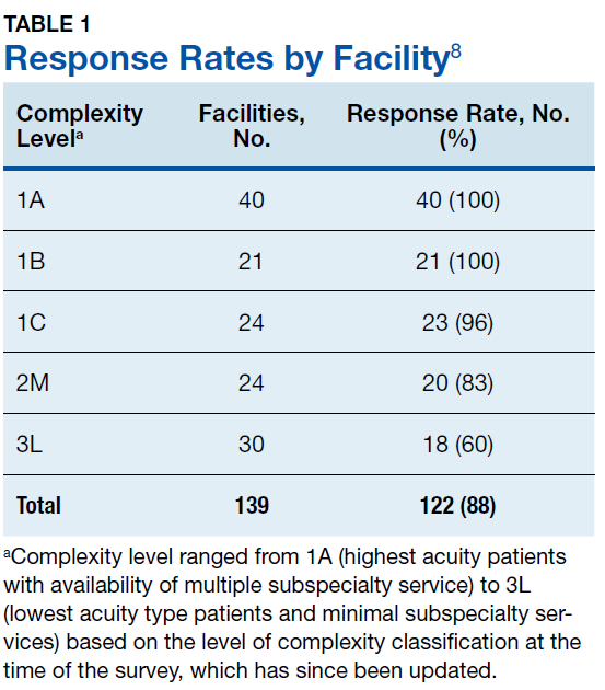 Study authors initially identified all 168 VA medical center facilities operating in 2017. Initial polling revealed that multiple facilities either were substations or had agreements for cardiology services from larger facilities, with 1 facility having 2 campuses with different levels of service at each. After adjusting for these nuances, the total number of potential respondents was 139. We obtained a response from 122 of the 139 facilities for an overall survey completion rate of 88%. Response rates varied by complexity level (Table 1). The survey received responses from all Level 1A and 1B facilities, 96% from Level 1C facilities; 83% (20/24) from level 2 facilities, and 62% (18/30) from level 3 facilities. (Please note that in the reference document providing detailed descriptions of the VA level of complexity has different numbers for each facility type given that there has been reassignments of the levels since our survey was completed.)8