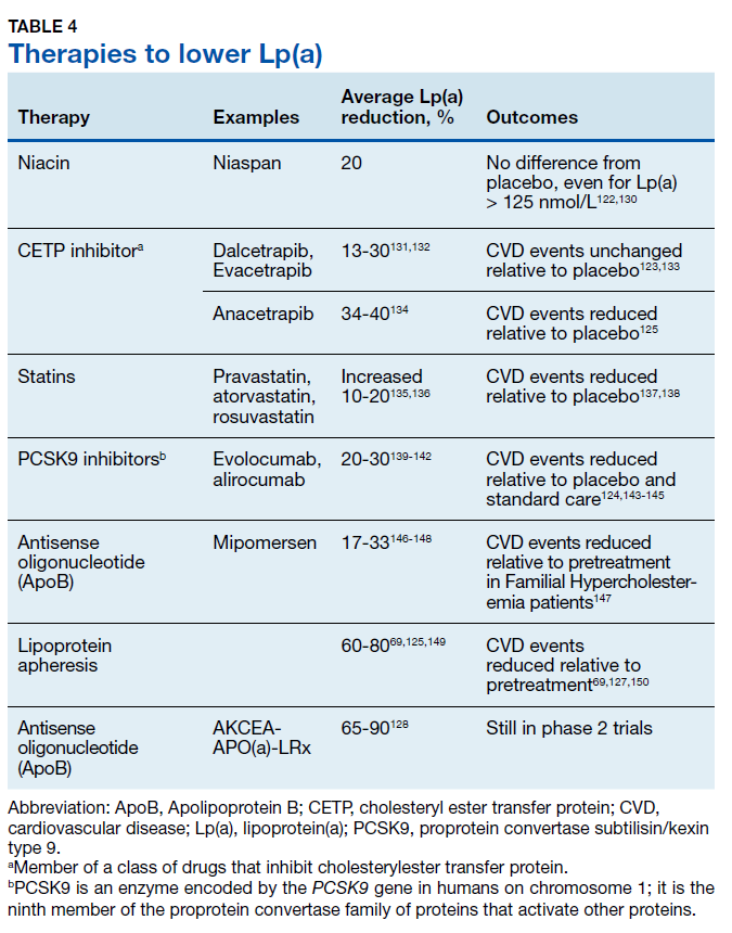 Until recently, there has been no evidence supporting any therapeutic intervention causing clinically meaningful reductions in Lp(a). Table 4 lists major drug classes and their effects on Lp(a) and CVD outcomes; however, a detailed discussion of each of these therapies is beyond the scope of this review. Drugs that reduce Lp(a) by 20-30% have varying effects on CVD outcomes, from no effect 122,123 to a 10% to 20% decrease in CVD events when compared with a placebo. 124,125 Because these drugs also produce substantial reductions in LDLC, it is not possible to determine how much of the beneficial effects are due to reductions in Lp(a).