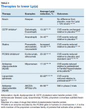 Lipoprotein apheresis produces profound reductions in Lp(a) of 60 to 80% in very highrisk populations. 69,126 Within-subjects comparisons show up to 80% reductions in CVD events, relative to event rates prior to treatment initiation. 69,127 Early trials of antisense oligonucleotide against apo(a) therapies show potential to produce similar outcomes. 128,129 These treatments may be particularly effective in patients with isolated Lp(a) elevations.