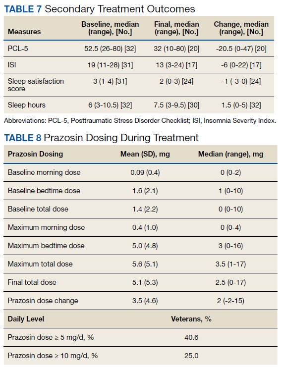 Maximum prazosin total daily doses were evaluated from the study baseline to the endpoint (Table 8). The mean (SD) maximum total daily dose of prazosin reached was 5.6 (5.1) mg (median, 3.5 mg; range, 1-17 mg). The mean (SD) total daily dose of prazosin at endpoint of study was 5.1 (5.3) mg (median, 2.5 mg; range, 0-17 mg). The average (SD) change of prazosin dose from baseline to endpoint was 3.5 (4.6) mg (median, 2 mg; range, -2 to 15 mg).