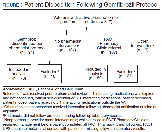 Pharmacists discontinued gemfibrozil by protocol for 94 patients (29.6%), and 107 patients (33.8%) were referred to the PACT Pharmacy Clinic (Figure 3). For the remaining 116 patients (36.6%), the drug interaction was addressed outside of the protocol for the following reasons: the drug interaction was resolved prior to pharmacist review; an interacting prescription was expired and not to be continued; the patient self-discontinued ≥ 1 interacting medications; the patient was deceased; the patient moved; the patient was receiving ≥ 1 interacting medications outside of the VA; or the prescriber resolved the interaction following notification by the pharmacist.