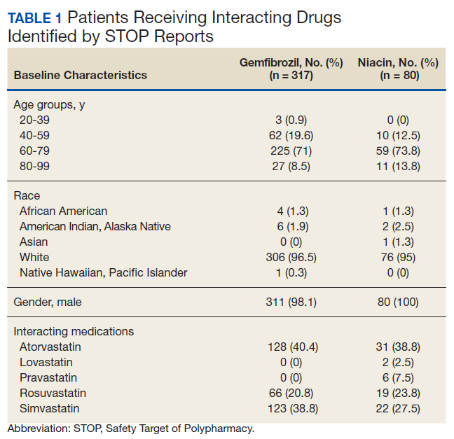 The original STOP report included 397 drug interactions involving statins with gemfibrozil or niacin (Table 1). The majority of patients were white and male aged 60 to 79 years. Gemfibrozil was the most common drug involved in all interactions (79.8%). The most common statins were atorvastatin (40%) and simvastatin (36.5%).