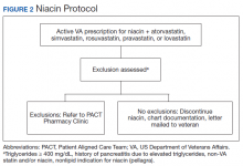 If patients met any of the exclusion criteria for discontinuation, the primary care provider (PCP) was notified to place a consult to the PACT Pharmacy Clinic for individualized interventions and close monitoring. Patients prescribed niacin for nonlipid indications were allowed to continue with their current drug regimen. At each encounter, the PACT CPS assessed for ADRs, made individualized medication changes, and arranged follow-up appointments. Once the interaction was resolved and treatment goals met, the PCP resumed monitoring of the patient’s lipid therapy.